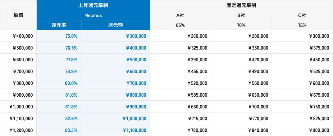 一方で、私たちNecmosが導入しているのが「上昇還元率制」です。